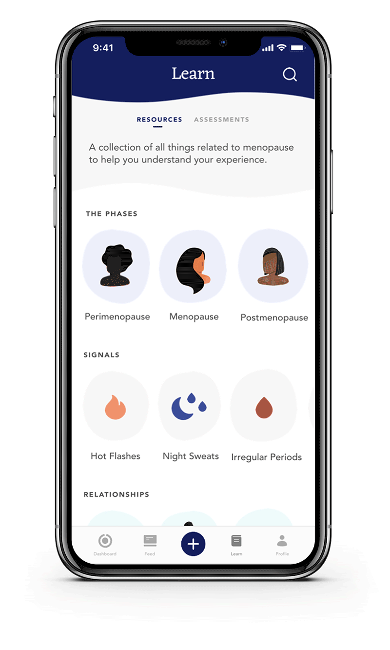A mobile app which personalizes and curates content, resources, and data visualizations based off of assessments and tracking input from the menopausal individual, wearables, and third-party apps.